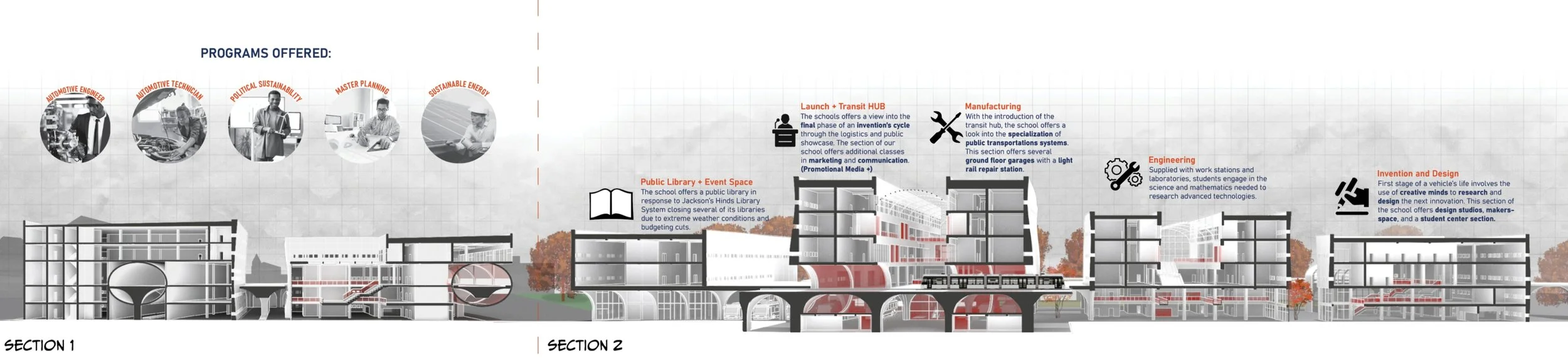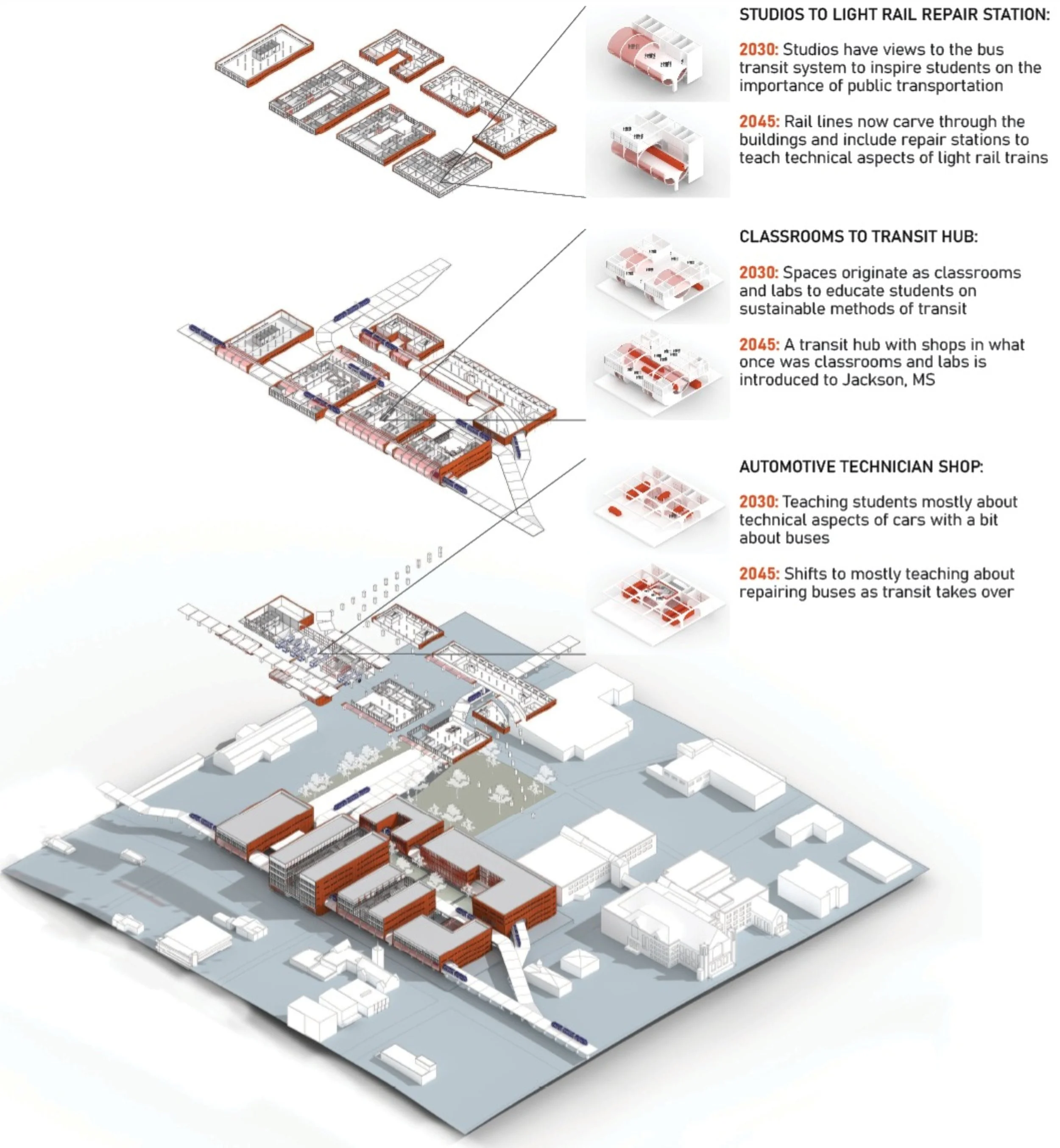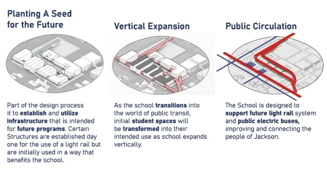 This project is a public boarding school that looks to implement sustainable transit in the city of Jackson, MS which is primarily known for its automotive manufacturing industry. With programs such as automotive engineer, automotive technician, political sustainability, sustainable energy, and master planning the school looks to teach young students how to implement more eco-friendly designs into the community. This school includes a transit hub for light-rail transit to be implemented throughout the city and revive the previous railroads that are no longer used.
