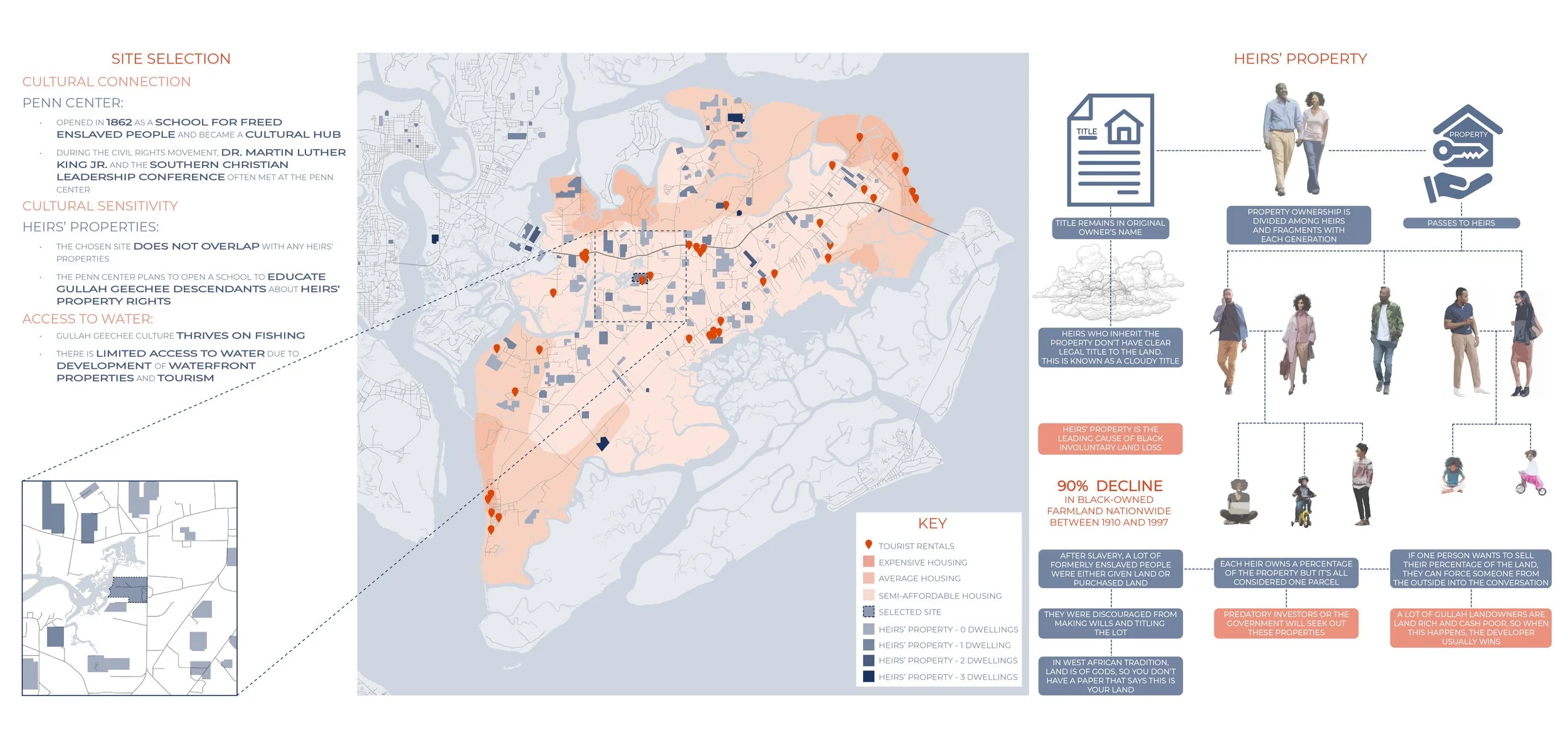 The Gullah Geechee people, descendants of enslaved Africans, have deep cultural ties to the land and water of the South Carolina Lowcountry, relying on sustainable farming and fishing practices passed down through generations. However, many families face challenges with heirs’ property, which threatens their land and heritage. Our project on St. Helena Island provides affordable housing in traditional shotgun-style homes, fostering a sense of permanency and community. A key feature is the Culture Center, which includes spaces for youth recreation, cultural learning, and legal resources to help families protect their land through the Heir’ Property School. By creating a space that celebrates and sustains Gullah Geechee culture, we ensure that future generations can thrive in harmony with their environment.